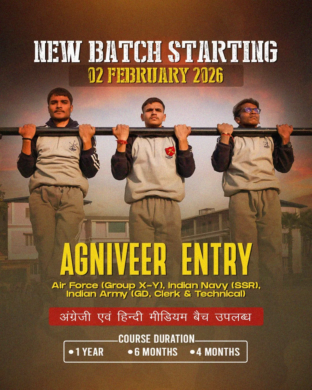 We are excited to announce the start of new batches for the CDS-I (2026) Exam Regular Course / Agniveer Entry in the Air Force (Group X-Y), Indian Navy (SSR) & Indian Army (GD, Clerk & Technical) / NDA-I (2026 Exam Regular Course) from 18th & 29th September. With expert guidance, well-structured study material and a disciplined environment, we prepare you to achieve your dream of joining the armed forces. The course is available in both English & Hindi medium with flexible durations of 1 year, 6 months or 4 months to suit your preparation needs. So take the first step towards a proud career in defence. Enrol today & secure your seat!
